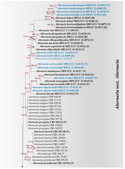 Phylogenetic tree of Alternaria sect. Alternaria generated by RAxML-based analysis of a combined ITS, LSU, SSU, tef1-α, rpb2, gapdh and Alt-a1 DNA sequence dataset. Bootstrap support values for maximum likelihood (ML, black) equal to or greater than 60% and Bayesian posterior probabilities (PP, red) equal to or greater than 0.95 PP are shown above the nodes. The tree is rooted to Alternaria alternantherae (CBS 124392). Newly species and generated strains are in blue, and the type strains are indicated in bold. Strains obtained from ex-type living culture are indicated by (T) and strains obtained from holotype specimen are indicated by (H).