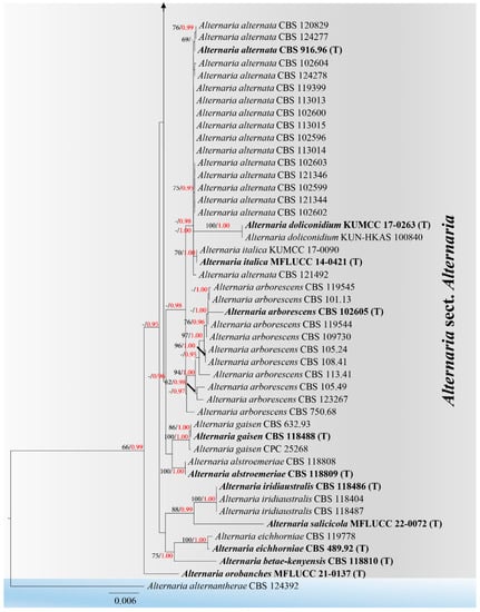 Six new species collected from dead herbaceous and monocotyledonous plants in Italy were analyzed with other representative Alternaria species in sect. Alternaria including Alternaria muriformispora (strain MFLUCC 22-0073; on Plantago sp.), A. obpyriconidia (strains MFLUCC 21-0121 and MFLUCC 14-0435; on Vicia faba), A. ovoidea (MFLUCC 14-0427; on Dactylis glomerata), A. pseudoinfectoria (MFLUCC 21-0126; on Chenopodium sp.), A. rostroconidia (MFLUCC 21-0136; on Arabis sp.) and A. torilis (MFLUCC 14-0433 and MFLUCC 21-0133; on Torilis arvensis). The analyses represented phylogenetic relationships of taxa in Alternaria sect. Alternaria as well as the placement of six new species. Phylogenetic construction of sect. Alternaria based on a combined ITS, LSU, SSU, tef1-α, rpb2, gapdh and Alt-a1 DNA sequence dataset comprises 96 sequences of 34 representative species in sect. Alternaria, and Alternaria alternantherae (CBS 124392) was selected as the outgroup taxon. The best scoring RAxML tree is shown in Figure 1 with the final ML optimization likelihood value of -11313.333238 (ln). The dataset consists of 4377 total characters, including gaps (ITS: 1–514 bp, LSU: 515–1368 bp, SSU: 1369–2295 bp, tef1-α: 2296–2540 bp, rpb2: 2541–3311 bp, gapdh: 3312–3897 bp, Alt-a1: 3898–4377 bp). RAxML analysis yielded 511 distinct alignment patterns and 8.3% of undetermined characters or gaps. Estimated base frequencies were as follows: A = 0.246733, C = 0.254032, G = 0.258489, T = 0.240746, with substitution rates AC = 0.896323, AG = 2.073824, AT = 1.043150, CG = 0.820017, CT = 4.179461 and GT = 1.000000. The gamma distribution shape parameter alpha = 0.020013 and the Tree-Length = 0.230674. Bayesian posterior probabilities (PP) from MCMC were evaluated with a final average standard deviation of split frequencies = 0.008527.