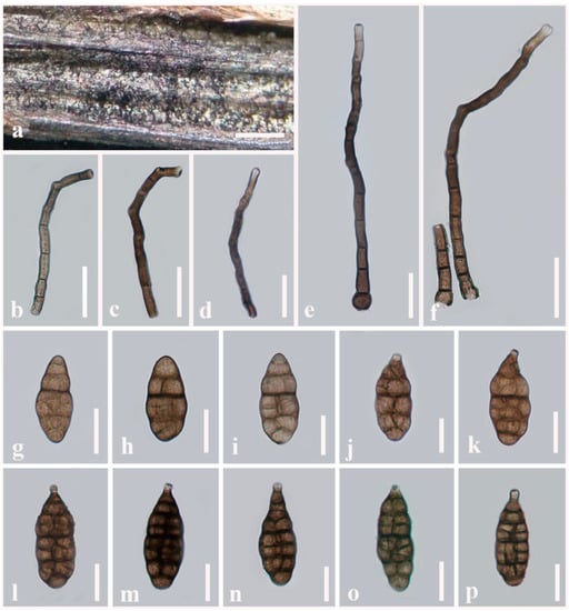 Alternaria muriformispora (MFLU 21-0309, holotype). (a) Colonies on dead aerial stem of Plantago sp. (Plantaginaceae); (b–f) Conidiophores bearing conidiogenous cells; (g–p) Conidia. Scale bars: (a) = 100 µm, (b–f) = 50 µm, (g,j–p) = 30 µm, (h,i) = 20 µm.
