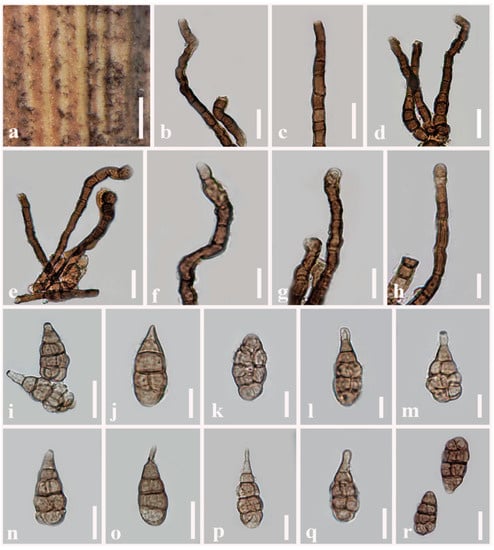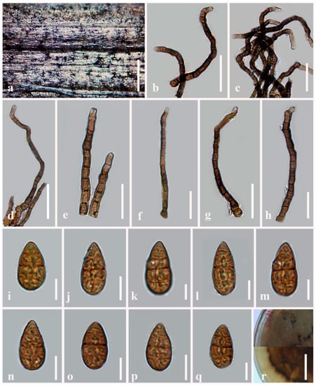 Alternaria obpyriconidia (MFLU 21-0300, holotype). (a) Colonies on dead stems of Vicia faba; (b–d) Conidiophores; (e–h) Conidiophores bearing conidiogenous cells; (i–r) Conidia. Scale bars: (a) = 1000 µm, (e) = 50 µm, (b–d,f–h,n–q) = 30 µm, (i–m,r) = 20 µm.