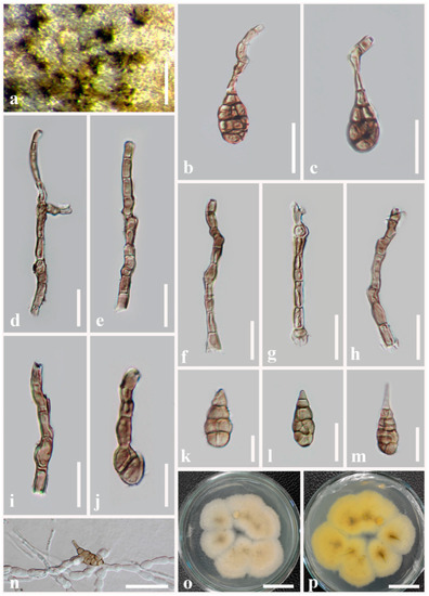 Alternaria pseudoinfectoria (MFLU 21-0311, holotype). (a) Colonies on dead stem of Chenopodium sp.; (b,c,j) Conidia formed apical secondary conidiophores; (d–i) Conidiophores; (k–m) Conidia; (n) Germinated conidium; (o,p) Colonies on PDA. Scale bars: (o,p) = 2 cm, (a) = 300 µm, (b–f,h,n) = 20 µm, (g,i,j) = 15 µm, (k–m) = 10 µm.