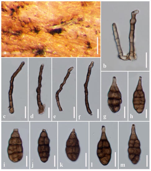 Alternaria rostroconidia (MFLU 21-0318, holotype). (a) Colonies on dead stems of Arabis sp; (b–f) Conidiophores bearing conidiogenous cells (g–m) Conidia. Scale bars: (a) = 200 µm, (e) = 50 µm, (b,d,f) = 30 µm, (c,g–m) = 20 µm.