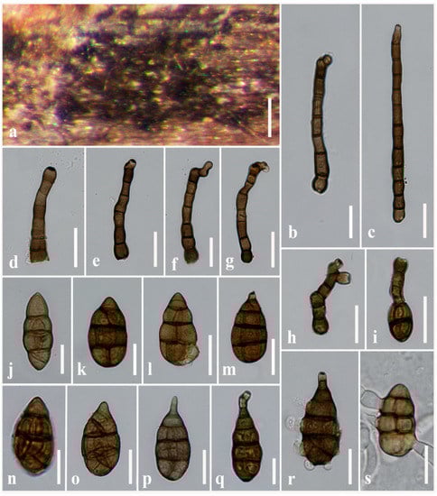 Alternaria torilis (MFLU 21-0299, holotype). (a) Colonies on stems of Torilis arvensis; (b–h) Conidiophores bearing conidiogenous cells; (i) Secondary conidiophores arising from conidium; (j–q) Conidia; (r,s) Germinated conidia. Scale bars: (a) = 200 µm, (c,g) = 30 µm, (b,d–f,h–s) = 20 µm.