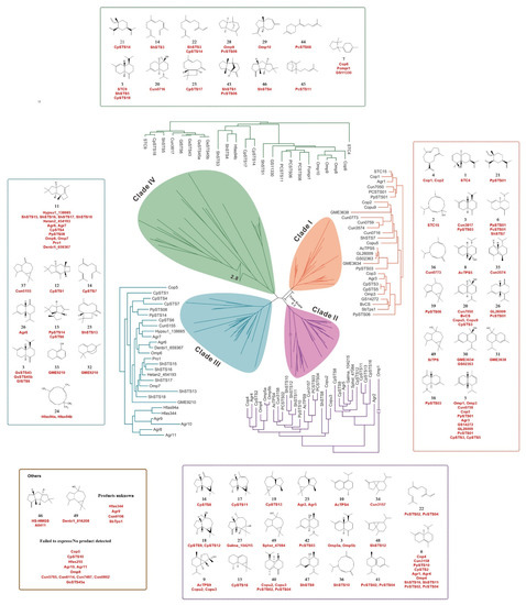 | Clade IV | C1,6 | NPP | α-Cuprenene (7) | Coprinopsis cinerea Ganoderma sinense Fomitopsis pinicola | Cop6 GS11330 Fompi1 |