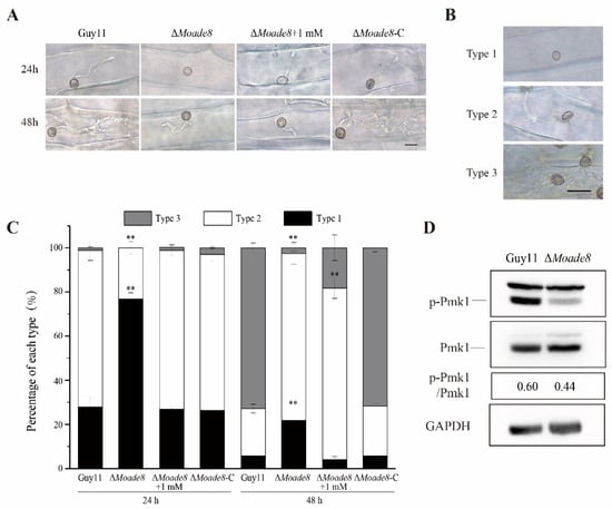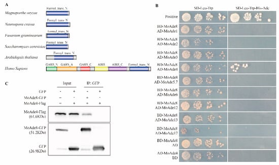 3.3. Exogenous Adenine Rescues the Pathogenicity-Related Phenotypes of ∆Moade8
