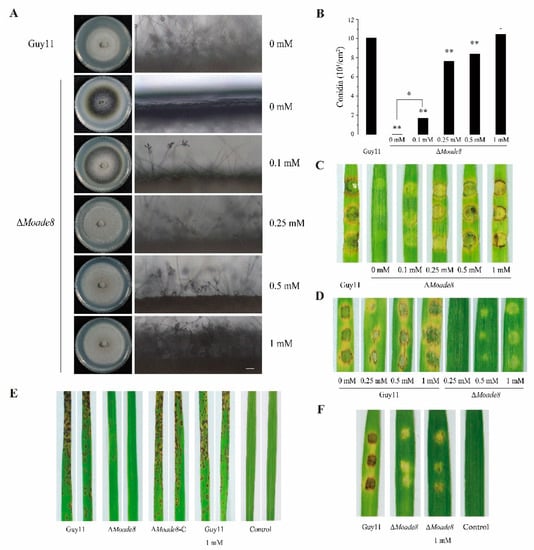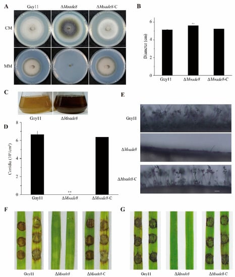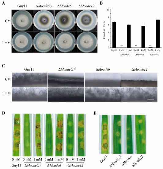 3.2. MoAde8 Is Essential for Conidiation and Virulence