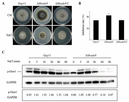 3.5. Deletion of MoADE8 Reduces Tolerance to Hyperosmotic Stress