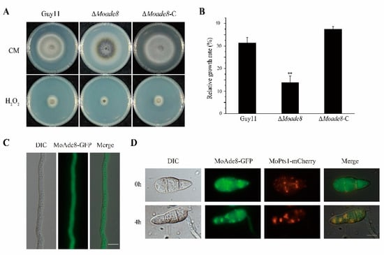 3.6. MoAde8 Is Related to Oxidative Stress Response and Co-Localize with Peroxisomes