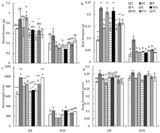 The effects of DSE inoculation, Trichoderma inoculation, and water conditions on the shoot biomass (a), root biomass (b), root length (c), and root diameter (d) of Astragalus mongholicus. The error bars represent the standard error of the mean. Different letters above the error bars indicate a significant difference at p < 0.05 by Tukey’s test. * means a significant difference between DS and WW. * p < 0.05, ** p < 0.01 and *** p < 0.001. The estimated means were presented when interactions were not significant. DS, drought stress conditions; WW, well-watered conditions. C indicates non-inoculated control. M, P, A, L, MA, ML, PA, and PL indicate plants inoculated with Macrophomina pseudophaseolina; Paraphoma radicina; Trichoderma afroharzianum; Trichoderma longibrachiatum; M. seudophaseolina + T. froharzianum; M. seudophaseolina + T. longibrachiatum; P. radicina + T. afroharzianum; P. radicina + T. longibrachiatum.