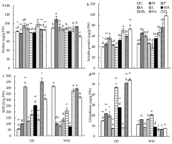 The effects of DSE inoculation, Trichoderma inoculation, and water conditions on the proline content (a), soluble protein content (b), SOD activity (c), and glutathione content (d) of Astragalus mongholicus. The error bars represent the standard error of the mean. Different letters above the error bars indicate a significant difference at p < 0.05 by Tukey’s test. * means a significant difference between DS and WW. * p < 0.05, ** p < 0.01. DS, drought stress conditions; WW, well-watered conditions. C indicates non-inoculated control. M, P, A, L, MA, ML, PA, and PL indicate plants inoculated with Macrophomina pseudophaseolina; Paraphoma radicina; Trichoderma afroharzianum; Trichoderma longibrachiatum; M. seudophaseolina + T. froharzianum; M. seudophaseolina + T. longibrachiatum; P. radicina + T. afroharzianum; P. radicina + T. longibrachiatum.