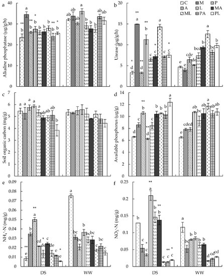 The effects of DSE inoculation, Trichoderma inoculation, and water conditions on soil alkaline phosphatase (a), soil urease (b), soil organic carbon (c), soil available phosphorus (d), soil ammonia nitrogen (e), and soil nitrate nitrogen (f). The error bars represent the standard error of the mean. Different letters above the error bars indicate a significant difference at p < 0.05 by Tukey’s test. * means a significant difference between DS and WW. * p < 0.05, ** p < 0.01. The estimated means were presented when interactions were not significant. DS, drought stress conditions; WW, well-watered conditions. C indicates non-inoculated control. M, P, A, L, MA, ML, PA, and PL indicate plants inoculated with Macrophomina pseudophaseolina; Paraphoma radicina; Trichoderma afroharzianum; Trichoderma longibrachiatum; M. seudophaseolina + T. froharzianum; M. seudophaseolina + T. longibrachiatum; P. radicina + T. afroharzianum; P. radicina + T. longibrachiatum.