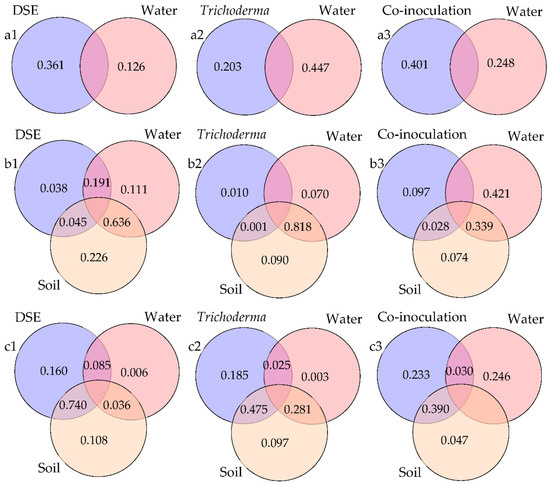 The variation partitioning analysis (VPA) of soil factors (a1–a3), growth indicators (b1–b3), and active ingredient contents (c1–c3) of Astragalus mongholicus. (a1): VPA of DSE inoculation and water conditions on soil factors; (a2): VPA of Trichoderma inoculation and water conditions on soil factors; (a3): VPA of co-inoculation and water conditions on soil factors. (b1): VPA of DSE inoculation, water conditions, and soil factors on growth and physiological parameters of A. mongholicus; (b2): VPA of Trichoderma inoculation, water conditions, and soil factors on growth and physiological parameters of A. mongholicus; (b3): VPA of co-inoculation, water conditions, and soil factors on growth and physiological parameters of A. mongholicus. (c1): VPA of DSE inoculation, water conditions, and soil factors on active ingredient contents of A. mongholicus; (c2): VPA of Trichoderma inoculation, water conditions, and soil factors on active ingredient contents of A. mongholicus; (c3): VPA of co-inoculation, water conditions, and soil factors on active ingredient contents of A. mongholicus.