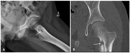 (A) Hip X-ray showed increased sclerosis with central lucency at the medial aspect of left femoral neck associated with the cortical irregularity and periosteal reaction; (B) Computed Tomography (CT) scan confirmed the erosive nature of the lesion with adjacent sclerosis and the adjacent bony overgrowth.