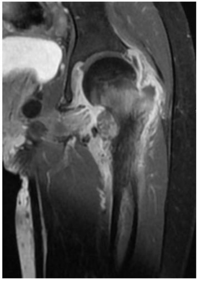 The patient was referred to the rheumatology service for further evaluation. Given the initial CT findings, Magnetic Resonance Imaging (MRI) of the hip was obtained, which showed evidence of chronic arthritis (Figure 2). Therefore, she was started on non-steroidal anti-inflammatory drug (NSAID) and given a working diagnosis of juvenile idiopathic arthritis (JIA).