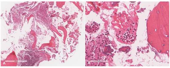 Histopathological findings in bone tissue (A) There are scattered bone trabeculae and fibroconnective tissue exhibiting dense inflammation and collection of hemosiderin-laden macrophages (lower left); (B) Collection of neutrophils forming micro-abscess.