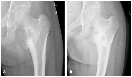 (A) Pre-surgical X-ray showed worsening of medial femoral erosions and destruction with adjacent sclerosis; (B) Post-surgical X-ray demonstrated interval sclerosis and healing with new bone formation along the medial aspect of femoral neck with interval reduction of erosive changes and medial neck lytic lesion.