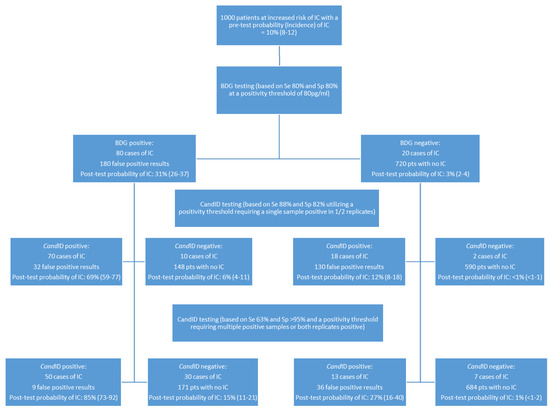 Using BDG as a primary test of 1000 patients with an incidence of IC of 10%, the probability of IC associated with a positive and negative BDG result is 31% and 3%, respectively. While an increasing BDG concentration can increase the likelihood of IFD, false positivity can be associated with high BDG levels (e.g., IVIG), and, obviously, BDG true positivity indicates IFD, not just IC [24]. BDG specificity can be improved through sequential positivity, but this involves additional sampling, potentially delaying diagnosis [25]. Incorporating CandID testing on the same serum sample potentially improves diagnostic understanding while providing species identification and minimizing delay. In patients already positive by BDG, the probability of IC in a patient who is also CandID positive in 1/2 replicates on a single occasion is 69%, whereas the probability of IC when the CandID is negative in a patient who was initially BDG negative is <1%. If a more stringent PCR positivity threshold requiring both PCR replicates to be positive is applied, then the probability of IC in a BDG-positive patient is increased to 85% (Figure 2).