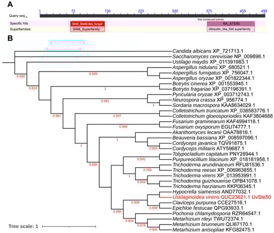 Using Saccharomyces cerevisiae adaptor protein Ste50 as a query, we identified only one STE50 ortholog, UV8b_07862 (QUC23621.1, hereafter UvSte50) from the U. virens genome (GenBank assembly accession: GCA_000687475.2) with BLASTP. UvSte50 was predicted to encode a 499-amino-acid protein with 41.38% identity to the Ste50 of S. cerevisiae. UvSte50 contains two domains, a sterile alpha motif (SAM) domain (72–129 aa) and a Ras-association (RA) domain (379–466 aa); as shown in Figure 1A. Phylogenetic analysis of proteins indicated that UvSte50 and the yeast Ste50 were clustered into different groups, where UvSte50 shared the highest similarity with Ste50 from Hypocrella siamensis (Figure 1B).