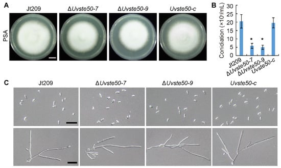 To characterize the roles of UvSte50 in U. virens, we generated gene deletion mutants of UvSTE50 using a homologous recombination strategy assisted with CRISPR-Cas9 system in the wild-type strain Jt209 []. Deletion strains were selected and further confirmed by RT-PCR and sequencing analysis (Figure S1a,b, Table S1). The mutant ΔUvste50 grew similarly to the wild-type Jt209 in PSA plates (Figure 2A), while ΔUvste50 showed a significant decrease in conidiation when inoculated in liquid PSB media (Figure 2B). Notably, the conidiation defect of ΔUvste50 was restored by complementation with the wild-type UvSTE50 in the complemented strain Uvste50-c (Figure 2B). However, ΔUvste50 did not exhibit detectable changes in conidial morphology and germination (Figure 2C and Figure S2). The width and length of conidia produced by ΔUvste50 and the germination rate of ΔUvste50 showed no difference from those for the wild-type Jt209 (Figure S2). These results suggest that UvSte50 plays an important role in conidiation of U. virens.