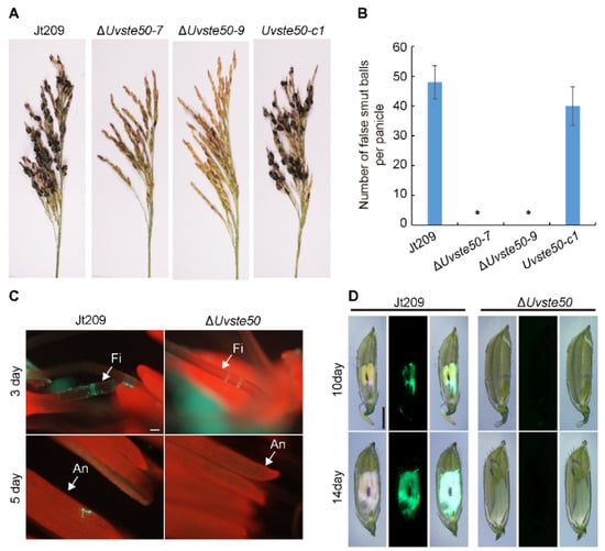 The virulence of ΔUvste50 was assessed through the inoculation of mycelia and conidia suspensions into rice panicles at booting stage (5–7 days before heading). After 30 days of incubation, ΔUvste50 did not cause disease on grains, and no false smut balls were visible on the rice panicles (Figure 3A,B). In contrast, approximately 40–50 small false smut balls were found on each spike inoculated with wild-type Jt209 and the complemented strain Uvste50-c (Figure 3A,B). In order to verify a pathogenicity defect of the mutant in vivo, the GFP gene driven by the promoter of the U. virens histone H3 gene was introduced into ΔUvste50 and the wild-type Jt209, and the resulting strains ΔUvste50-GFP and Jt209-GFP were used to inoculate rice panicles. As shown in Figure 3C, at 3–5 dpi, the GFP signals of ΔUvste50-GFP were restricted within the stamen filaments, while GFP signals of Jt209-GFP were observed from the stamen filaments and anthers (Figure 3C). At 10–14 dpi, the spikelets infected by Jt209-GFP were full of white hyphae and the GFP signals were observed to cover floral organs, while no hyphae were observed inside the spikelets infected by ΔUvste50-GFP (Figure 3D). Hyphae of U. virens initially infects the stamen filaments and then extends to embrace the inner floral organs inside the spikelets of rice [,]. Therefore, our results suggest that the infection process of ΔUvste50 was blocked at the stamen filaments.