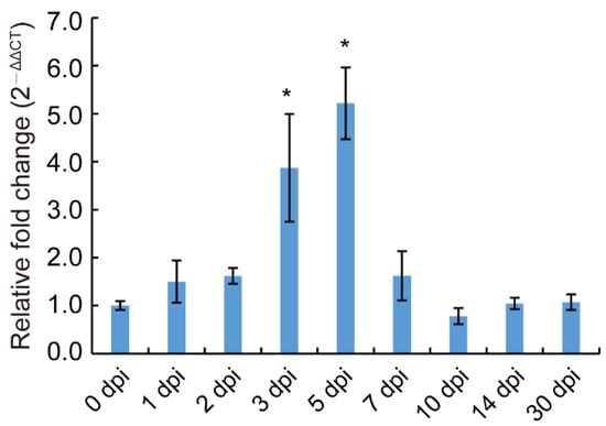 The relative expression profiles of UvSTE50 during the infection process of U. virens were determined by RT-qPCR. Samples of inoculated rice spikelets at 0, 1, 2, 3, 5, 7, 14, and 30 dpi were collected. The expression level of UvSTE50 showed an upward trend in the early stage of inoculation, reaching the highest value at 5 dpi, which was 4.2-fold of the expression level at the initial inoculation (Figure 4). After that, the expression level of UvSTE50 showed a downward trend (Figure 4). Hyphae of U. virens typically infect the stamen filaments at 3–5 dpi [,]; thus, the expression peak of UvSTE50 at 5 dpi suggests that UvSTE50 plays a crucial role in the early infection process of U. virens.