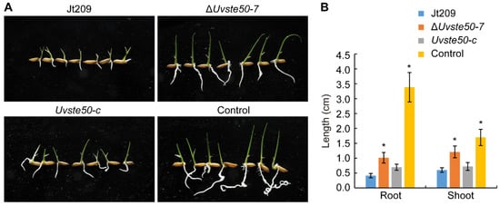 To investigate whether UvSte50 affects the production of phytotoxic compounds, we collected PSB culture filtrates from 5-day-old wild-type Jt209, ΔUvste50 mutant, and from the complemented strain Uvste50-c, which were subjected to rice seed germination assays. After soaking Liangyoupeijiu rice seeds in PSB medium (control group) and different culture filtrates of U. virens for 5 days, it was observed that the germination rate of rice seeds in each treatment was basically the same, but the germination status was quite different. In the control group treated with liquid PSB, the root length of germinated rice seeds reached 3.38 ± 0.49 cm, while the shoot length reached 1.70 ± 0.27 cm. However, the growth of roots and shoots of rice seeds treated with filtrates of U. virens was inhibited, to a certain extent (Figure 5A,B). The root length was only 0.41 ± 0.07 cm when rice seed were treated with filtrates of wild-type strain Jt209, while the root growth was longer when treated with filtrate of ΔUvste50 mutant, reaching 1.02 ± 0.18 cm (Figure 5A,B). The shoot length of rice treated with the filtrate of Jt209 was 0.60 ± 0.08 cm, while that with ΔUvste50 was 1.21 ± 0.20 cm (Figure 5A,B). Thus, the shoots of rice also grew longer when treated with filtrate of ΔUvste50 mutant, compared to those treated with the wild-type and complemented strains under the same conditions (Figure 5). These results suggest that culture filtrates of ΔUvste50 are less toxic, in terms of rice seed germination, and therefore, UvSTE50 may be involved in regulating the production of phytotoxic compounds in U. virens.