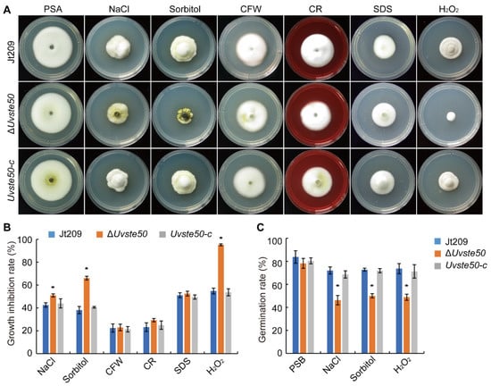 To assess the effect of UvSte50 in regulating U. virens adaptation to pathogenesis- or morphogenesis-associated stress, the radial growth of Jt209, ΔUvste50, and Uvste50-c was compared on PSA plates containing hyperosmotic stress agents (NaCl or sorbitol), cell-wall-damaging agents (calcofluor white, CFW; sodium dodecyl sulfate, SDS; or Congo red, CR), or an oxidative stress agent (H2O2). For this purpose, 5 mm mycelial plugs of each strain were inoculated in PSA plates containing exogenous 0.5 M NaCl, 0.6 M sorbitol, 500 µg/mL CFW, 100 µg/mL CR, 0.05% SDS, or 0.05% H2O2. The plates were incubated at 28 °C for 20 days in the dark, and colony diameters and inhibition rates were calculated as described previously [,,]. To determine the influence of hyperosmotic and oxidative stress during conidium germination, both the conidia of mutant and wild type were incubated in liquid PSB media or with 0.3 M NaCl, 0.3 M sorbitol, or 0.01% H2O2, and germ tubes were observed after 20 h []. Each treatment was repeated three times.