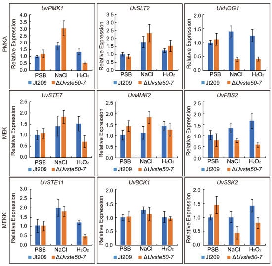 The genes involved in MAPK signaling pathways are known to regulate stress-related genes in U. virens and other fungi [,,,]. To determine whether the deletion of UvSTE50 affected the expression of three MAPK (UvPMK1: UV8b_03045, UvSLT2: UV8b_00381 and UvHOG1: UV8b_04241), three MEKK (UvSTE11: UV8b_06470, UvBCK1: UV8b_01370 and UvSSK2: UV8b_02087), and three MEK (UvSTE7: UV8b_04866, UvMKK2: UV8b_02817 and UvPBS2: UV8b_02207) in U. virens, RNA samples were isolated from hyphae of the wild-type strain Jt209 and ΔUvste50 mutant, harvested from regular PSB cultures and cultures treated with 0.5 M NaCl or 0.05% H2O2 for 5 h. In the wild-type strain Jt209, the expression of all tested genes presented no significant change when treated with 0.05% H2O2, while NaCl treatment resulted in increased expression of UvPMK1, UvSLT2, and UvSTE11 (Figure 7). In the ΔUvste50 mutant, the expression of UvPMK1 and UvSLT2 was up-regulated by over two-fold in the presence of NaCl, and the expression of UvHOG1 and UvSSK2 was reduced by over two-folds under treatment with 0.5 M NaCl or 0.05% H2O2 (Figure 7).