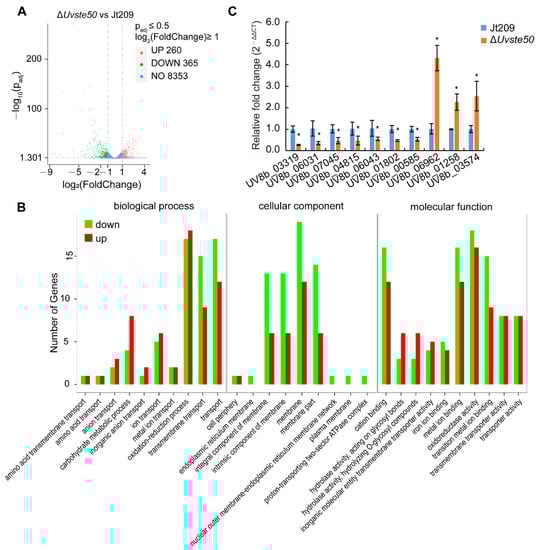 Gene Ontology (GO) enrichment analysis was conducted to determine the functions of DEGs [], from which all DEGs could be assigned to three functional groups: biological process, cellular component, and molecular function (Figure 8B, Table S3). Several enriched GO terms implied that UvSte50 is required for the oxidation–reduction process (GO:0055114 and GO:0016491) and membrane (GO:0016020) in U. virens (Figure 8B, Table S3).