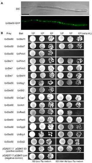 Given that UvSte50 is indispensable for the maintenance of virulence in U. virens, we questioned which signaling pathway may be implicated with UvSte50. To identify UvSte50-interacting partners, we performed an affinity capture–mass spectrometry (MS) assay for UvSte50. Briefly, the total protein was isolated from the UvSte50-GFP strain, and GFP-trap agarose (ChromoTek, Planegg, Germany) was used to capture the UvSte50-interacting proteins. The elution proteins from the beads were analyzed by mass spectrometry. The ΔUvste50 strain transformed with empty pKD1-GFP was used as a negative control. In the assay, we discovered that UvSte7 (UV8b_04866), UvSte11 (UV8b_06470), and UvHog1 (UV8b_04241), which are homologous to yeast Ste7, Ste11, and Hog1, respectively, co-purified with UvSte50 (Table 1). We thus raised a hypothesis that UvSte50 may physically interact with the MAPK modules Ste11-Ste7-Pmk1 and UvHog1-MAPK. To test this, we conducted yeast two-hybrid assays. As shown in Figure 9B, UvSte50 interacted with UvSte7, UvSte11, and UvHog1. Although there was no interaction between UvSte50 and UvPmk1, UvSte7, and UvSte11 interacted with UvPmk1 (Figure 9B and Figure S5). The affinity capture–mass spectrometry assay also showed that cAMP signaling pathway components UvAc1 (UV8b_02467) and UvCap1 (UV8b_00969, homologous to yeast Srv2) were co-purified with UvSte50 (Table 1), and the yeast two-hybrid assay also confirmed this result (Figure 9B and Figure S5). Other proteins identified in the affinity capture mass-spectrometry assay included peroxisomal biogenesis factor 6 (UV8b_06597), GTPase-activating protein (Gyp2; UV8b_04168), cAMP-dependent protein kinase regulatory sub-unit (UV8b_04860), and regulator of G protein signaling pathway (UV8b_04229); see Table 1, Figure 9B and Figure S5. These results provide evidence supporting our hypothesis that UvSte50 interacts with the MAPK modules Ste11-Ste7 and UvHog1. Therefore, UvSte50 might govern the fungal pathogenicity of U. virens by means of the cAMP and MAPK signaling pathways.