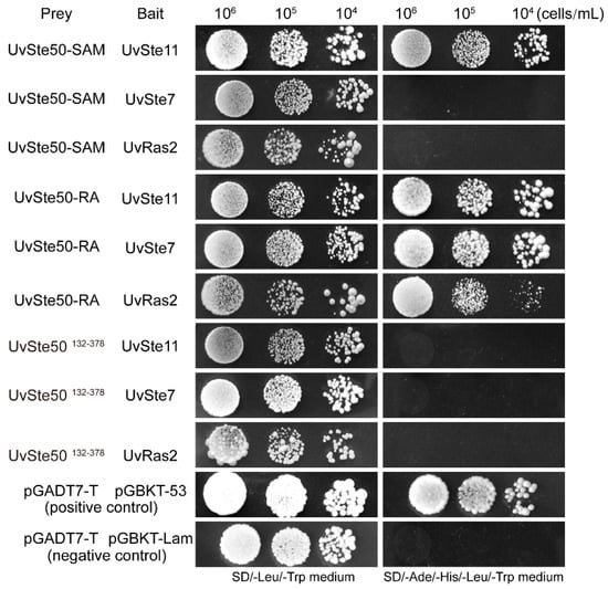 In S. cerevisiae, Ste50 did not interact with Ste7 in yeast two-hybrid assays []. Furthermore, in U. maydis, no direct interactions between Ubc2 (Ste50 ortholog) and Ubc4/Fuz7 (Ste7 orthologs) were observed []. In contrast, a direct interaction between Ste50 and Ste7 has been observed in M. oryzae [] and F. graminearum []. Both the SAM and RA domain of Mst50 in M. oryzae are dispensable for the Mst50–Mst7 interaction [], while, in F. graminearum, only the RA domain is necessary for the interaction between FgSte50 and FgSte7 []. Our yeast two-hybrid assays also suggested that the RA domain, but not SAM domain, is essential for the interaction between UvSte50 and UvSte7 in U. virens (Figure 10).