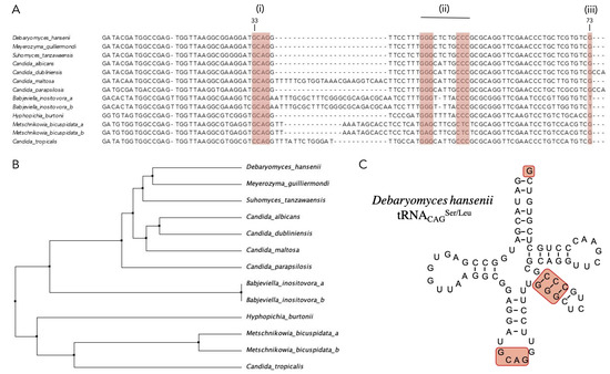 Nucleotide sequences of tRNAs from the CTG clade (M. bicuspidata1 ID: 30032540, locus METBIDRAFT_t152; M. bicuspidata2 ID: 30032539, locus METBIDRAFT_t151; H. burtonii ID: 30998607, locus HYPBUDRAFT_t106; C. tropicalis ID: D17535.1; C. dubliniensis ID: 8048316, locus tRNA-Ser (CAG); C. albicans ID: 30515292, locus tS(CAG)1; S. tansawaensis ID: 30986355, locus CANTADRAFT_t43; C. parapsilosis ID: 59387608, locus CPAR2_t_cp_Ser(CAG)_61; B. inositovora1 ID: 30151225, locus BABINDRAFT_t382, and B. inositovora2 ID: 30150929, locus BABINDRAFT_t115; C. maltosa ID: D26074.1) were aligned with Clustal Omega and edited using MUSCLE (https://www.ebi.ac.uk/Tools/msa/clustalo/ accessed on 4 February 2020).