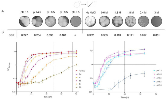 Colony morphology, velocity rate, and growth curves of D. hansenii under salinity and pH stress conditions. (A) Colony morphology after 72 h growing on solid media. (B) SGR and growth curves. NaCl concentration left and pH variation right. Dotted lines: RNA RT-qPCR sampling. n = no growth.