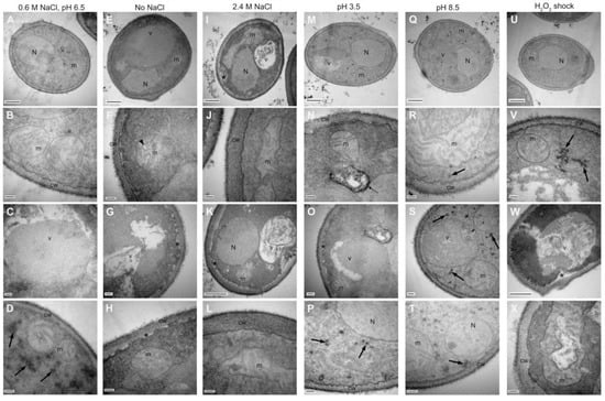 Ultrastructural changes of Debaryomyces hansenii by TEM. Micrographs of cells exposed to standard condition (A–D) no salt, (E–H) hypersalinity, (I–L) acidity, (M–P) alkalinity, (Q–T) and an oxidative shock (U–X). Upper row: panoramic view, 500 nm bar; second row: mitochondria detail, 100 nm bar; third row: vacuole detail, 100 nm bar (C,G,O,S) and 500 nm bar (K,W); bottom row: cell wall detail, 100 nm bar. N, nuclei; m, mitochondria; v, vacuole; cw, cell wall. Black arrows (D,P,R,S,T,V), carbohydrates cumulus; arrowhead (F), mitochondrial cristae; discontinuous arrow (N), electron-dense zone; asterisk (G,H,I,K,O,W) plasmatic membrane and cell wall discontinuity.