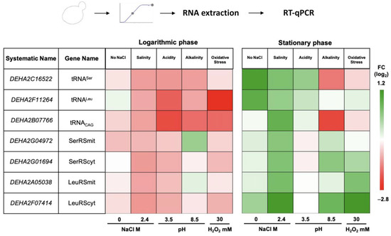 We evaluated differential gene expression of tRNACAG and LeuRS and SerRS genes in cultures after growth in stress conditions selected above and without NaCl. D. hansenii codes for one tRNACAG; two SerRS–SerRScyt and SerRSmit; and two LeuRS–LeuRScyt and LeuRSmit. We also selected two single copy tRNAs, tRNALeu and tRNASer, with the lowest usage frequency to compare their expressions (Figure 4 and Figure S2).