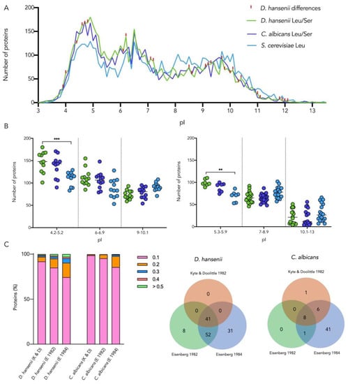 Protein isoelectric points (pI) of D. hansenii, C. albicans, and S. cerevisiae proteomes were retrieved from Isoelectric Point DataBase (https://isoelectricpointdb.org/, accessed on 15 July 2021). The pI value of D. hansenii and C. albicans proteins was computed as 5.68 for Serine and 5.98 for Leucine for each CUG codon.