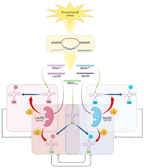 Aminoacylation of tRNACAG with either serine or leucine. Different stress conditions alter the expression of aaRS and tRNAs. The aaRS transcripts are translated into SerRS proteins and LeuRS proteins (purple arrows). The expression of tRNAs (green arrows) in different proportions, establishes competition for their aminoacylation. Changes in the concentration of tRNALeu and tRNASer alter the proportions of active sites available for loading tRNACAG with Serine or Leucine (tRNACAGSer/tRNACAGLeu) by aaRS activity (red arrows). An increased concentration of tRNACAG loaded with either amino acid (blue arrows) could change the proportion of serine and leucine in the D. hansenii proteome. Each aminoacylation reaction is enclosed in a colored rectangle, and competition is represented with black inhibition lines considering that the occurrence of one reaction inhibits the other. Created using biorender.com.