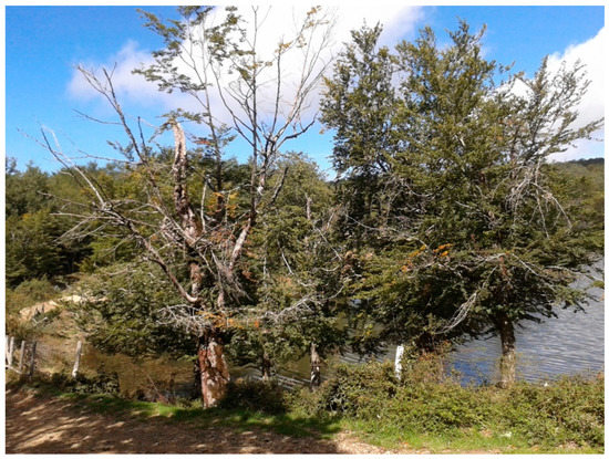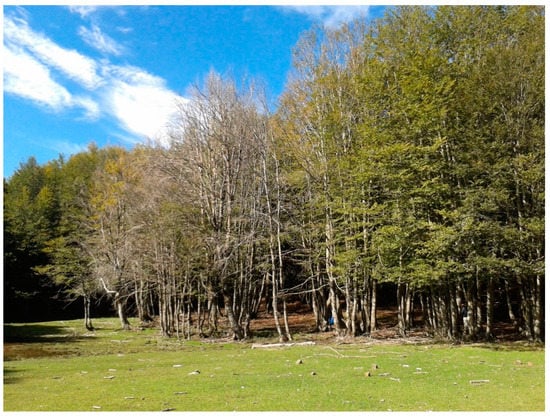 Sampling activities were carried out from the last week of May to the first week of June 2020 in an almost pure, mature (>60 years old) beech forest stand of Nebrodi RP. A circular area (about 28 km2), with a diameter of around 6 km, was ideally delimited around Mount Soro (37°55′53′′ N, 14°41′39′′ E), in the municipality of Cesarò, province of Messina (ME), Sicily, southern Italy. It also encompassed the high altitude Biviere Lake (37°57′11′′ N, 14°42′52′′ E), in the same municipality, and the high altitude Maulazzo Lake (37°56′31′′ N, 14°40′18′′ E), in the municipality of Alcara li Fusi (ME). The geological nature of the soil was marly claystone. Individual scattered trees or groups of trees showed severe decline symptoms. Overall, samples were taken from 40 beech trees of the same age and size (around 60–70 years old and 20–25 m in height, respectively): 20 trees were apparently healthy or with mild symptoms of canopy thinning, while 20 showed severe symptoms of decline, including canopy thinning, twig and branch dieback, leaf yellowing, extensive dieback of the whole crown, and, in a few cases (five trees), bleeding stem cankers (Figure 3). The trees were separated into two groups based on the severity of decline symptoms, which was rated visually according to the classification of the crown condition (defoliation and foliage transparency) by Schomacher et al. and Eichhorn et al. [17,18]. Trees within the 0 to 25 foliage transparency classes were considered healthy, while trees within the 50 to 100 foliage transparency classes were included in the group of declining trees. The 40 trees were randomly selected across the study area. However, all the 40 selected trees were at least 150 m apart from each other to exclude the clustering of data and the small-scale effect of the sampling site. Sampled trees were georeferenced using a portable GPS tracker (GPS AT-17; Autoseeker Electronics Co. Ltd., Shenzhen, China), to avoid sampling bias and sampling overlapping.