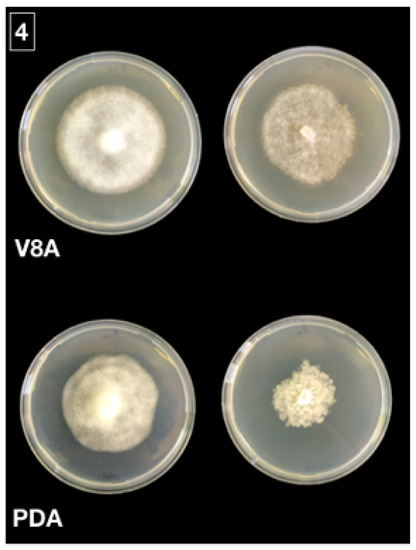 Colony morphologies of Phytophthora × cambivora (upper row and bottom row to the left; isolate MSK1A) and P. gonapodyides (upper row and bottom row to the right; isolate MSC1A) after 4 days growth at 20 °C in the dark on V8A and PDA.