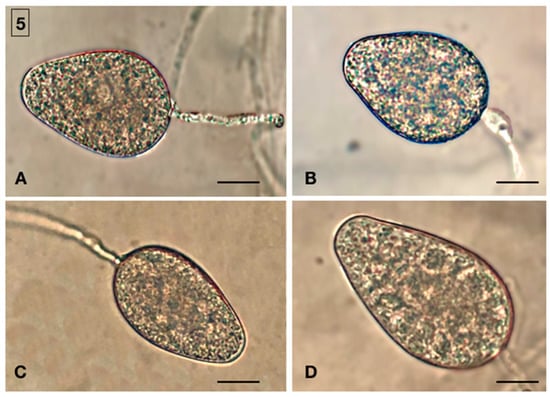 Isolations from leaf baits, roots, and rhizosphere soil of symptomatic and asymptomatic beech trees sampled in the forest stand of Mount Soro in the Nebrodi RP yielded Phytophthora isolates all with the same colony morphology. In total, 30 (10 from leaf baits, 10 from fine roots and 10 from soil) randomly selected, single-hypha tip isolates were characterized. The isolates formed uniform, woolly colonies with a coralloid mycelium on both V8 agar (V8A) and potato dextrose agar (PDA) (Figure 4). Minimum and maximum temperature were below 5 °C and above 35 °C, respectively, with an optimum at 25 °C. Plugs from cultures grown on V8A flooded with non-sterile soil extract produced ovoid, elongated, less frequently ellipsoid, obpyriform, or limoniform, non papillate to semipapillate, persistent, and internally proliferating sporangia (Figure 5). Sporangium dimensions averaged 65 ± 11 × 40 ± 6 μm. Chlamydospores were absent. All isolates were heterothallic and formed antheridia, oogonia, and oospores only, when paired with reference P. nicotianae isolates of the A1 and A2 mating types. In paired cultures, antheridia were amphyginous, elongated, and very frequently bicellular. Oogonia showed a tapering base, and their outer wall was ornamented (bullate or verrucose), which is a distinctive character of very few Phytophthora species, including P. × cambivora. Oospores were globose, thick-walled, and plerotic, with a large central ooplast and an average diameter of 35 ± 4 µm. The proportion of A1 and A2 mating types was quite balanced among isolates from leaf baits (4 and 6 isolates out of 10, respectively) and soil (5 and 5 isolates out of 10, respectively), while the A2 type largely prevailed over the A1 type among isolates from roots (8 out of 10 isolates).