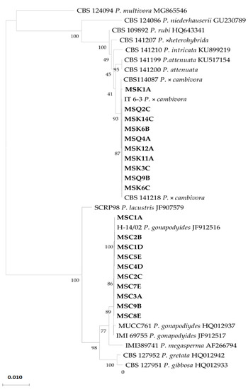 Amplification and sequencing of the Internal Transcribed Spacer (ITS) regions of the ribosomal DNA (rDNA) of the isolates of the first species recovered from the beech trees revealed 99%100% identity with the sequence of the ex-neotype isolate of P. × cambivora (CBS141218), while isolates of the second species showed 100% identity with a reference isolate (IMI 69755) of P. gonapodyides [9]. In the tree obtained by the phylogenetic analysis of the combined data set of sequences from ITS and cytochrome c oxidase subunit I (Cox I) regions of isolates recovered from beech and sequences of Phytophthora species used as references, all isolates from the roots and soil clustered (bootstrap values of 1000 replicate) with the reference isolates of P. × cambivora, while isolates from the stem bark clustered with the reference isolates of P. gonapodyides (Figure 6). The accession numbers of the ITS and Cox I sequences of the isolates of P. × cambivora and P. gonapodyides sourced from the bark, roots, and rhizosphere soil of the beech trees in the Mount Soro forest stand deposited in GenBank are listed in Table 1.