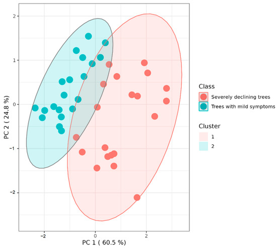 K-means cluster analysis of standardized values of the three examined variables (proportion of beech roots infected by P. × cambivora, foliage transparency of beech trees, and inoculum density of P. × cambivora in rhizosphere soil of beech trees) grouped the samples into two clusters: trees with mild symptoms and severely declining trees. The sum of the principal component (PC) reached 85.3% of the total variance, of which PC1 (proportion of infected fibrous roots) represented 60.5% and PC2 (inoculum density) represented 24.8% of the total variances. In the area comprised within the two clusters, samples with symptoms intermediate to the two classes examined were aggregated (Figure 7), indicating that foliage transparency is a discriminant between the two classes.