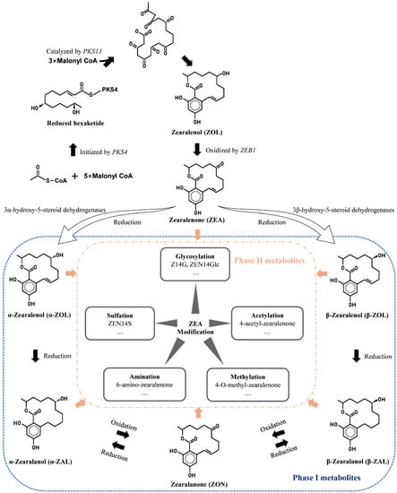 Although masked ZEA can be generated in multiple ways, the modified ZEA is generally classified into two categories, phase I and phase II metabolites (Figure 1). Phase I conversion means that free ZEA is oxidized, reduced, or hydrolyzed, such as α/β-ZOL, α/β-zearalanol (α/β-ZAL), and zearalanone (ZON). It is usually deemed as a transforming process to higher toxicity for ZEA because of the more estrogen-like structure alteration. Phase II conversion, during which ZEA or phase I metabolites are conjugated with endogenous molecules such as sugars, amino acid, acetic, and sulfate, is regarded as a detoxification process. During these courses, more hydrophilic compounds are synthesized, facilitating the elimination of mycotoxins.