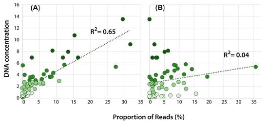 Relationship between the DNA concentration (ng/μL) and the proportion of reads for each Phytophthora species in the mock community (MIX2) for (A) amplification with ITS primer set P4 and (B) amplification with rps10 primer set P10. The data points are coded based on the DNA concentration as per Figure 2; the darker colours correspond to higher DNA concentration. The R2 value is for the goodness of fit based on simple linear regression.