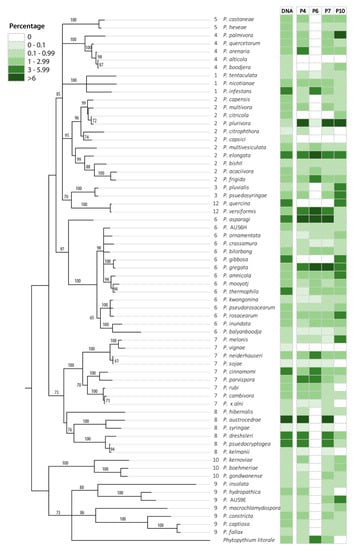 - Bose, T.; Wingfield, M.J.; Roux, J.; Vivas, M.; Burgess, T.I. Phytophthora species associated with roots of native and non-native trees in natural and managed forests. Microb. Ecol. 2021, 81, 122–133. [Google Scholar] [CrossRef] [PubMed]