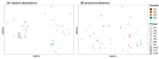 The nonmetric multidimensional scaling (NMDS) plot demonstrates the community composition of environmental samples (i.e., E1–E4) amplified by 10 primer sets. Each sample was run in triplicate. Community composition from (A) relative abundance data (stress = 0.174) and (B) presence–absence data (stress = 0.173).