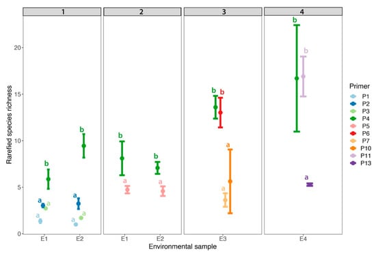 Mean rarefied species richness of environmental samples (i.e., E1–E4) across three replicates for 10 different primers. Each panel demonstrates the primers used across 4 sequencing runs. Letters indicate significant differences among primers in each run (i.e., each run was analysed separately). Points represent the means ± standard deviations.