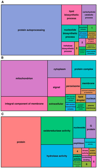 GOFeat annotation: Distinct identified genes proportionally displayed by main Gene Ontology categories. (A) Biological process. (B) Cellular component. (C) Molecular function. 1 aflatoxin biosynthetic process. 2 G protein-coupled receptor signaling pathway. 3 pathogenesis. 4 alpha,alpha-trehalose-phosphate synthase (UDP-forming) activity. 5 signal recognition particle binding. 6 triglyceride lipase activity.