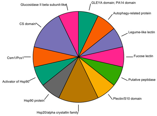 In the present study, at least 14 proteins appear to be related to the processes of adhesion and recognition of the host by the fungus. Among them, four have lectin-like domains (gleya, PA14, Legume-like lectin family, Legume lectin domain, and Fungal fucose-specific lectin). One predicted domain corresponds to the binding protein domain (plectin/S10 domain), two belong to the peptidase MA clan (Putative peptidase family and Glucosidase II beta subunit-like protein), and all the others are associated with hydrophobins: hsp1 and hsp2 (Figure 2).