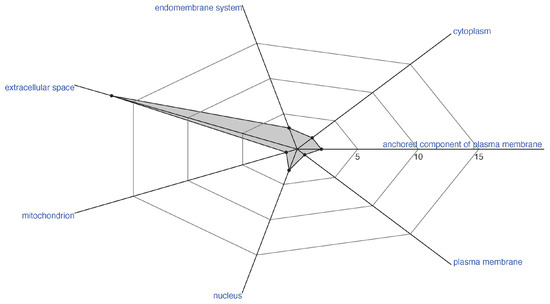 Distinct subcellular location of detected enterotoxins of the entomopathogenic fungi Ophiocordyceps australis. Dots and shadowed areas in the radar plot proportionally depict the number of enterotoxins in each subcellular location.